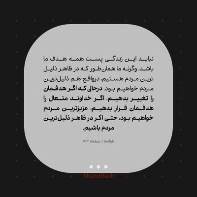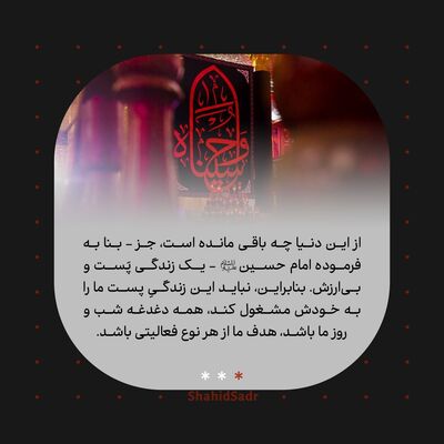 مگر تا کی در این دنیا زندگی میکنیم که بخواهیم چیزی از این دنیا بگیریم؟ و مگر از این دنیا چه باقی مانده که بخواهیم این دنیایی زندگی کنیم؟ از این دنیا چه باقی مانده است، جز - بنا به فرموده امام حسین(ع) - یک زندگی پست و بی ارزش. بنابراین، نباید این زندگی پست ما را به خودش مشفول کند، همه دغدغه شب و روز ما باشد، هدف ما از هر نوع فعالیتی باشد. نباید این زندگی پست همه هدف ما باشد، وگرنه ما همانطور که در ظاهر ذلیلترین مردم خواهیم بود. درحالی که اگر هدفمان را تغییر بدهیم، اگر خداوند متعال را هدفمان قرار بدهیم، عزیزترین مردم خواهیم بود، حتی اگر در ظاهر ذلیلترین مردم باشیم. [شهید سید محمدباقر صدر، کتاب بارقهها، صفحه 462]