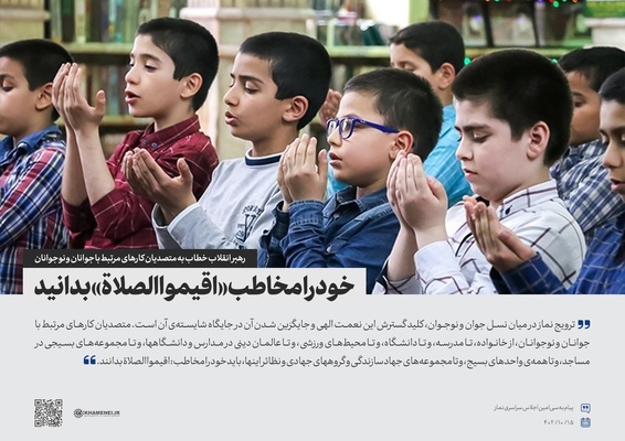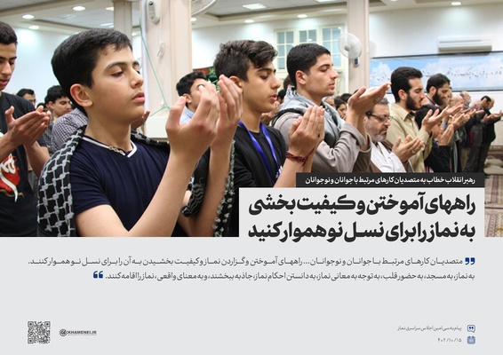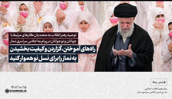 رهبر معظم انقلاب در پیامی به سی‌امین اجلاس سراسری نماز، ترویج نماز در میان نسل جوان و نوجوان را کلید گسترش این نعمت الهی و جایگزین شدن آن در جایگاه شایسته‌ آن دانستند و از متصدیان کارهای مرتبط با جوانان و نوجوانان خواستند تا خود را مخاطب «اقیموا الصلاة» بدانند و به معنای واقعی، نماز را اقامه کنند. برش‌هایی از پیام حضرت آیت‌الله خامنه‌ای در مجموعه سخن‌نگاشت ارائه شده، مرور می‌شود.