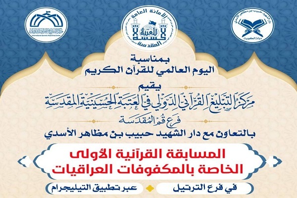 به گزارش ایکنا از عراق، این مسابقات به همت شعبه قم مرکز بینالمللی تبلیغ قرآنی وابسته به آستان مقدس امام حسین(ع) و با همکاری مرکز قرآنی «حبیب بن مظاهر الاسدی» کویت برگزار میشود.
