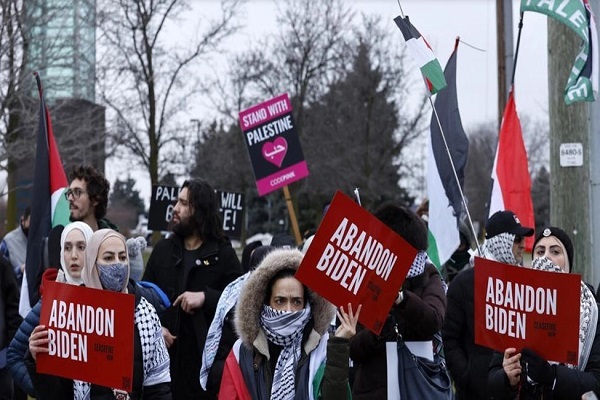 دهها مسلمان و عرب آمریکایی با در دست داشتن تابلوهایی با مضامین «بایدن را رها کن» و «خوش آمد نمیگوییم» در سالن مدرسهای در دیربورن، میشیگان جمع شدند و در آنجا سخنرانیهای آتشین ایراد کردند، شعار دادند و رئیس جمهور جو بایدن را به خاطر ایستادن در کنار اسرائیل در جنگ علیه اسرائیل محکوم کردند.