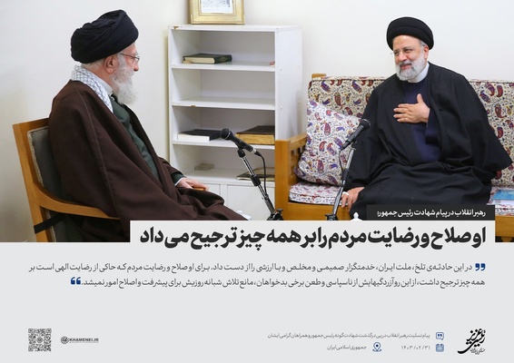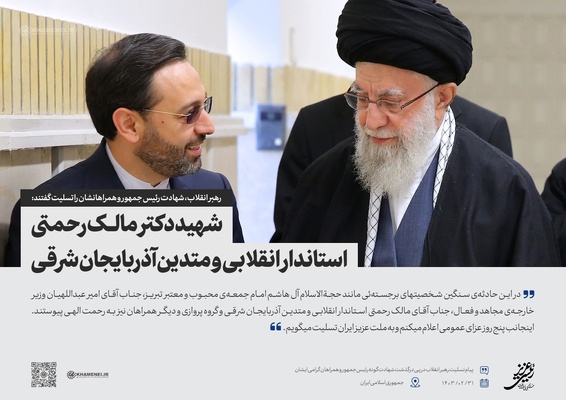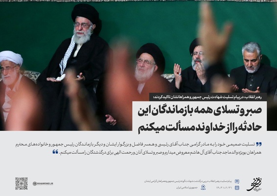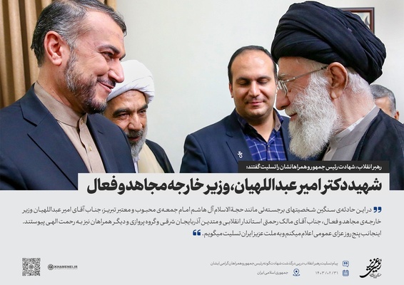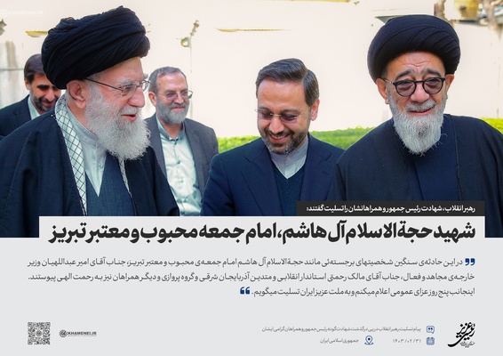 رهبر معظم انقلاب در پیامی شهادت آیتالله سیدابراهیم رئیسی، رئیسجمهور، حسین امیرعبداللهیان، وزیر امور خارجه، آیتالله سید محمدعلی آلهاشم، نماینده ولیفقیه در آذربایجان شرقی، مالک رحمتی، استاندار آذربایجان شرقی و همراهان گرامی ایشان در سانحه هوایی را تسلیت گفتند. مجموعهای از سخننگاشت بر اساس پیام رهبر معظم انقلاب را در قالب فتوتیتر مشاهده میکنید.