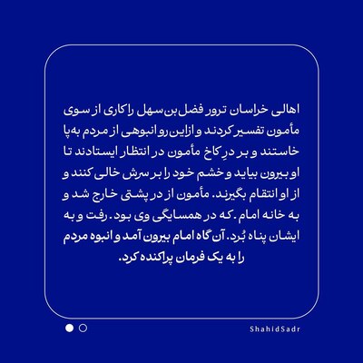 اهالی خراسان ترور فضلبنسهل را کاری از سوی مأمون تفسیر کردند و از اینرو انبوهی از مردم بهپا خاستند و بر درِ کاخ مأمون در انتظار ایستادند تا او بیرون بیاید و خشم خود را بر سرش خالی کنند و از او انتقام بگیرند. مأمون از در پشتی خارج شد و به خانه امام ـ که در همسایگی وی بود ـ رفت و به ایشان پناه بُرد. آن گاه امام بیرون آمد و انبوه مردم را به یک فرمان پراکنده کرد. این یعنی در همان سرزمینی که مأمون در آن حکومت میکرد و درواقع در همان شهری که حکومت را به مأمون داده بود و با نیرو و سپاه او را یاری میکرد، در همان سرزمین، پشتوانه مردمی و اجتماعی امام به چنین حدی رسیده بود؛ بگذریم از پشتوانه علمی و فکری و پیشوایی علمی و فکری ایشان که نمونههای بسیاری از آن سراغ دارید. [علامه صدر، کتاب امامان اهلبیت(ع)، صفحه ۶١٨]