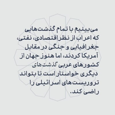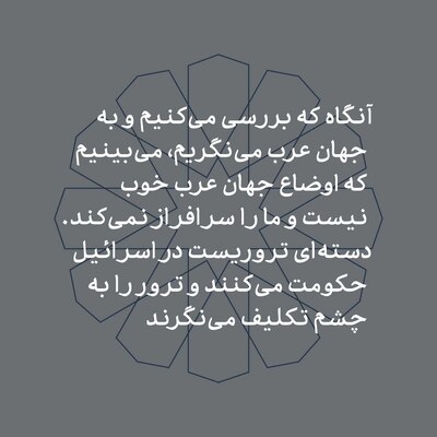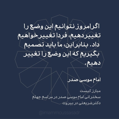دسته‌ای‌ تروریست‌ در اسرائیل‌ حکومت‌ می‌کنند و ترور را به‌ چشم‌ تکلیف‌ می‌نگرند و می‌خواهند رسالتِ مقدسِ آزاد کردنِ فلسطین‌ را ترور بنمایانند. در عین‌ حال‌، در جهان‌، کسانی‌ را می‌بینیم‌ که‌ به‌ حرفِ نامناسبِ آن‌ها گوش‌ سپرده‌اند. این‌ اوضاع‌ ما را پریشان‌ و ناراحت‌ می‌کند. خوب‌ که‌ به‌ جهانِ خود می‌نگریم‌، می‌بینیم‌ با تمام‌ گذشت‌هایی‌ که‌ اعراب‌ از نظر اقتصادی‌، نفتی‌، جغرافیایی‌ و جنگی‌ در مقابل‌ آمریکا کردند، اما هنوز جهان‌ از کشورهای‌ عربی‌ گذشت‌های‌ دیگری‌ خواستار است‌ تا بتواند تروریست‌های‌ اسرائیلی‌ را راضی‌ کند. به‌ هیچ‌ وجه‌ نمی‌توانیم‌ این‌ وضع‌ را پذیرفتنی‌ بدانیم‌. [بخشی از سخنرانی امام موسی صدر در مراسم چهلم دکتر شریعتی در بیروت]