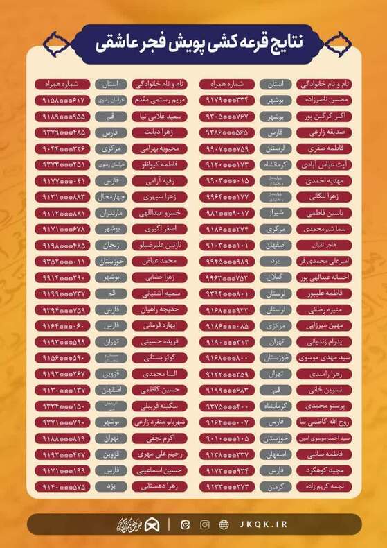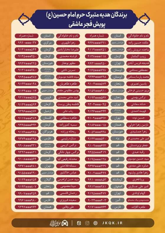 با پایان این پویش، اسامی برندگان این پویش شامل 128 برنده سفر به مشهد مقدس و 114 برنده هدیه متبرک حرم امام حسین(ع) پس از قرعهکشی اعلام شد.