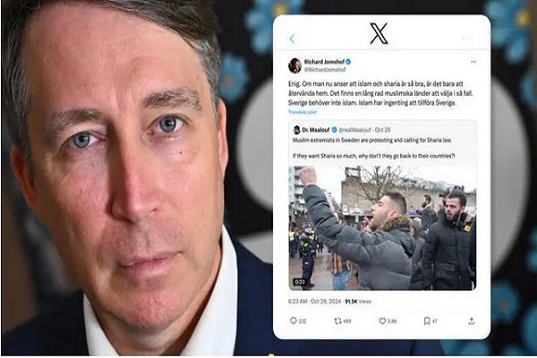 به گزارش ایکنا به نقل از وبگاه الکومپس، ریکارد یومسهوف، رئیس کمیته عدالت در پارلمان سوئد و یکی از رهبران حزب دموکرات سوئد(SD)، ویدئویی را در پلتفرم "X" (توئیتر سابق) از حساب کاربری به نام Dr. Maalouf ویدیویی را بازنشر کرد که در آن ادعا شده است مسلمانان رادیکال در سوئد در حال تظاهرات و خواهان اجرای حکومت اسلامی در سوئد هستند.