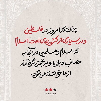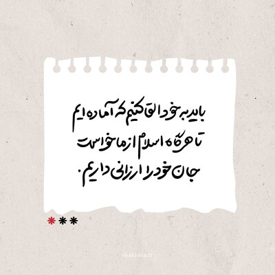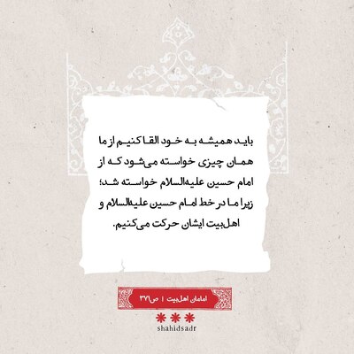 باید به خود القا کنیم که آمادهایم تا هرگاه اسلام از ما خواست، جان خود را ارزانی داریم. چنانکه امروز در فلسطین و در بسیاری از کشورهای امت اسلام که اسلام و مسلمین در آنجا به مصائب و بلایا و بدبختیها گرفتارند، از ما خواسته میشود. باید همیشه به خود القا کنیم از ما همان چیزی خواسته میشود که از امام حسین(ع) خواسته شد؛ زیرا ما در خط امام حسین(ع) و اهلبیت(ع) ایشان حرکت میکنیم. [شهید سید محمدباقر صدر، امامان اهلبیت(ع)، صفحه ٣٧١]