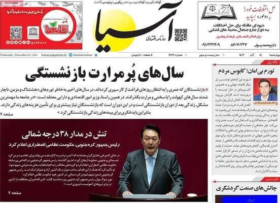 صفحه نخست روزنامههای چهارشنبه ۱۴ آذر ۱۴۰۳ را که به نقض آتش بس، حکومت نظامی در کره جنوبی، تصویب قیمت جدید بنزین و مهمترین رویدادهای ورزشی پرداختهاند؛ در ادامه مشاهده میکنید.