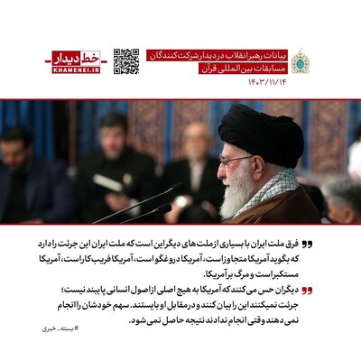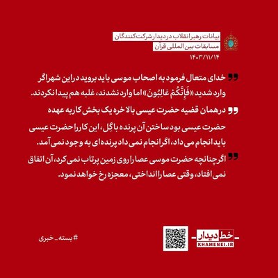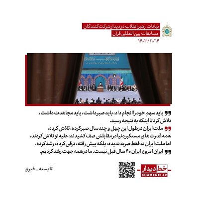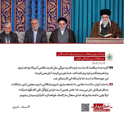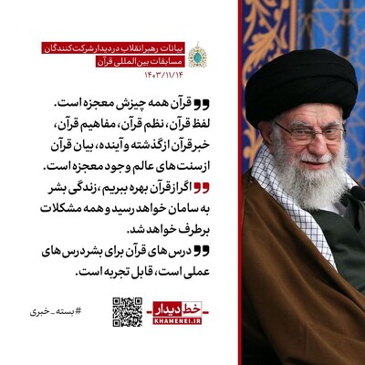 مجموعهای از بیانات رهبر معظم انقلاب در دیدار شرکتکنندگان در چهل و یکمین مسابقات بینالمللی قرآن ایران، در قالب فتوتیتر منتشر شد. در این مجموعه بیانات ایشان که درباره قرآن کریم، راهحل مشکلات، ملت ایران و غزه ایراد شده است، مرور میشود.