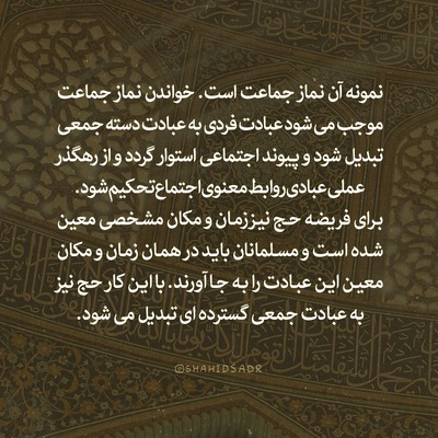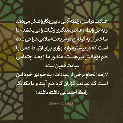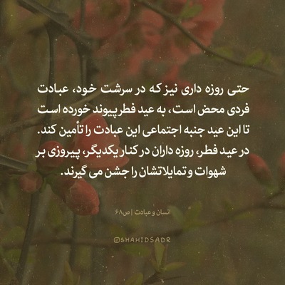 روزه‌داری نیز که در سرشت خود، عبادت فردی محض است، به عید فطر پیوند خورده است تا این عید جنبه اجتماعی این عبادت را تأمین کند. در عید فطر، روزه‌داران در کنار یک‌دیگر، پیروزی بر شهوات و تمایلاتشان را جشن می‌گیرند. [شهید محمدباقر صدر، کتاب انسان و عبادت، صفحه ۶۸]