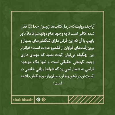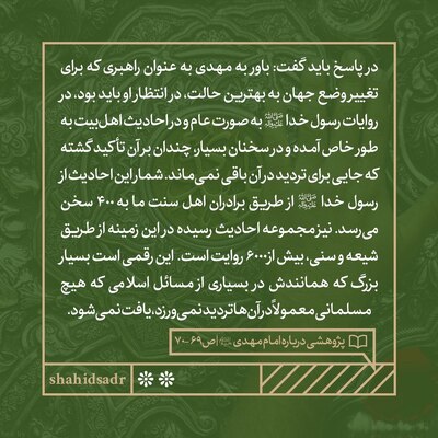 باور به مهدی(عج) به عنوان راهبری که برای تغییر وضع جهان به بهترین حالت، در انتظار او باید بود، در روایات رسول خدا(ص) به صورت عام و در احادیث اهل‌بیت(ع) به طور خاص آمده و در سخنان بسیار، چندان بر آن تأکید گشته که جایی برای تردید در آن باقی نمی‌ماند. شمار این احادیث از رسول خدا(ص) از طریق برادران اهل سنت ما به ۴٠٠ سخن می‌رسد. نیز مجموعه احادیث رسیده در این زمینه از طریق شیعه و سنی، بیش از ۶٠٠٠ روایت است. این رقمی است بسیار بزرگ که همانندش در بسیاری از مسائل اسلامی که هیچ مسلمانی معمولاً در آن‌ها تردید نمی‌ورزد، یافت نمی‌شود. [شهید محمدباقر صدر، کتاب پژوهشی درباره امام مهدی(عج)، ص۶۹-۷۰]