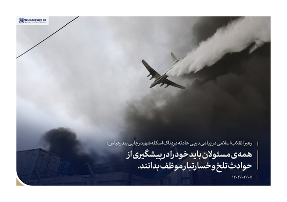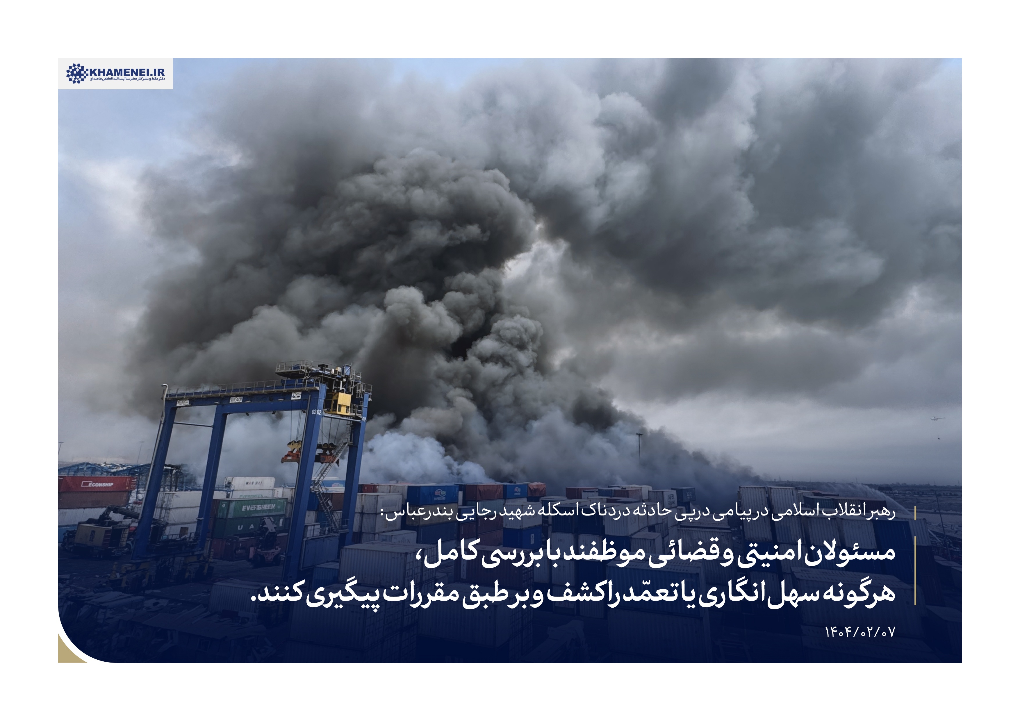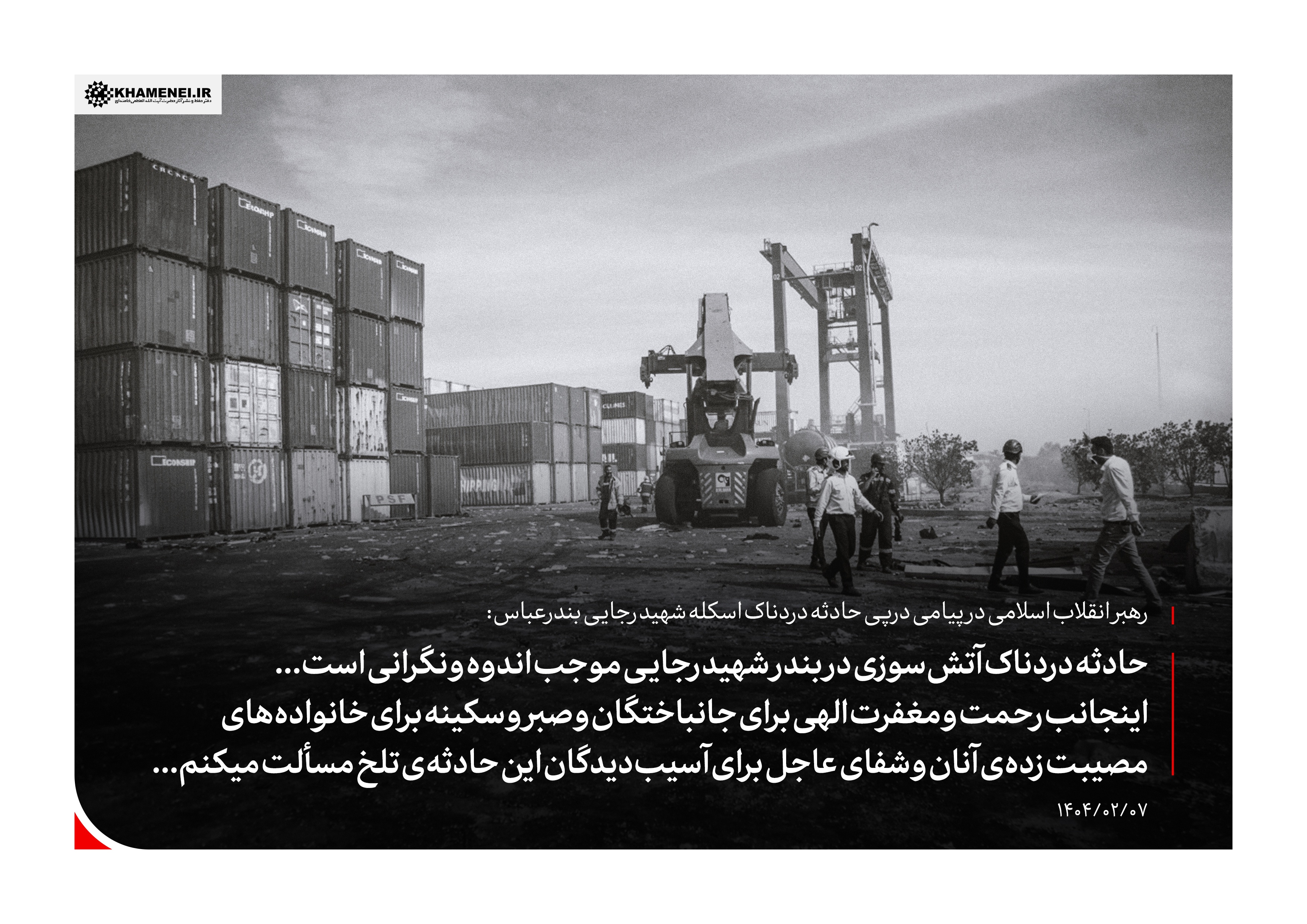 در پی حادثه دردناک آتشسوزی در بندر شهید رجایی بندرعباس، رهبر معظم انقلاب در پیامی ضمن تسلیت به خانوادههای مصیبتزده، مسئولان امنیتی و قضائی را موظف کردند که هرگونه سهلانگاری یا تعمّد در این حادثه را بهطور کامل بررسی و کشف کرده و بر طبق مقررات پیگیری نمایند. در این مجموعه سخننگاشت بر پیام رهبر معظم انقلاب مرور شده است.
