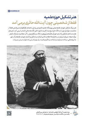 رهبر معظم انقلاب اسلامی در بخشی از پیام به همایش «یکصدمین سالگشت بازتأسیس حوزه علمیه قم» بیان کردند «ولی هنر بزرگ تشکیل حوزه علمیّه یعنی پرورشگاه علم و عالِم و دین و دَیّن با همه ظرافتها و تدبیرهایش فقط از شخصیّت مؤیَّدی چون آیتالله حاج شیخ عبدالکریم حائری (اعلی الله مقامه فی الجنان) برمیآمد». در مجموعه سخننگاشت ارائه شده، مروری بر پیام رهبر معظم انقلاب شده است.