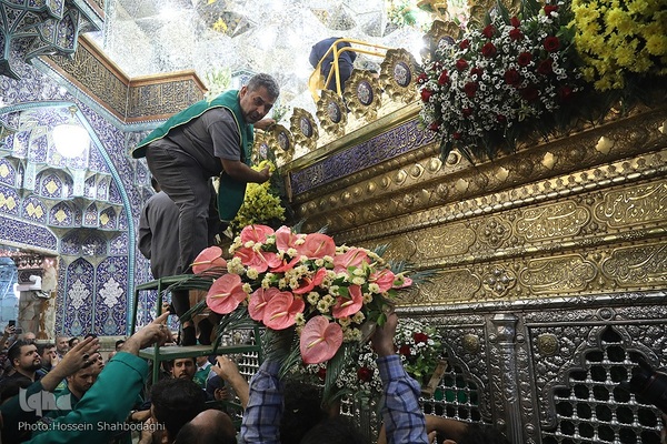 همزمان با فرا رسیدن سالروز ورود حضرت معصومه(س) به شهر قم، آیین گل آرایی ضریح مطهر کریمه اهل بیت(س) برگزار شد.