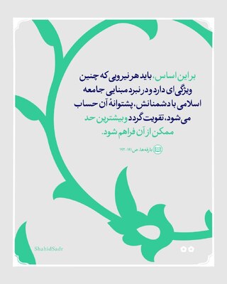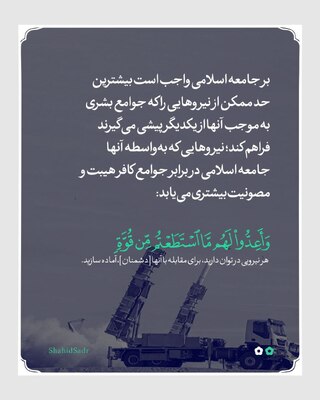 بر جامعه اسلامى واجب است بيشترين حد ممكن از نيروهايى را كه جوامع بشرى به موجب آنها از يكديگر پيشى مىگيرند فراهم كند؛ نيروهايى كه بهواسطه آنها جامعه اسلامى در برابر جوامع كافر هيبت و مصونيت بيشترى مىيابد: «وَ أَعِدُّوا لَهُمْ مَا اسْتَطَعْتُمْ مِنْ قُوَّةٍ» هر نيرويى در توان داريد، براى مقابله با آنها [دشمنان]، آماده سازيد. بر اين اساس، بايد هر نيرويى كه چنين ويژگىاى دارد و در نبرد مبنايى جامعه اسلامى با دشمنانش، پشتوانه آن حساب مىشود، تقويت گردد و بيشترين حد ممكن از آن فراهم شود. [شهید سید محمدباقر صدر، کتاب بارقهها ص۱۹۰_۱۹۱]
