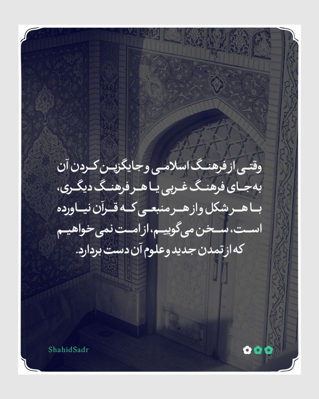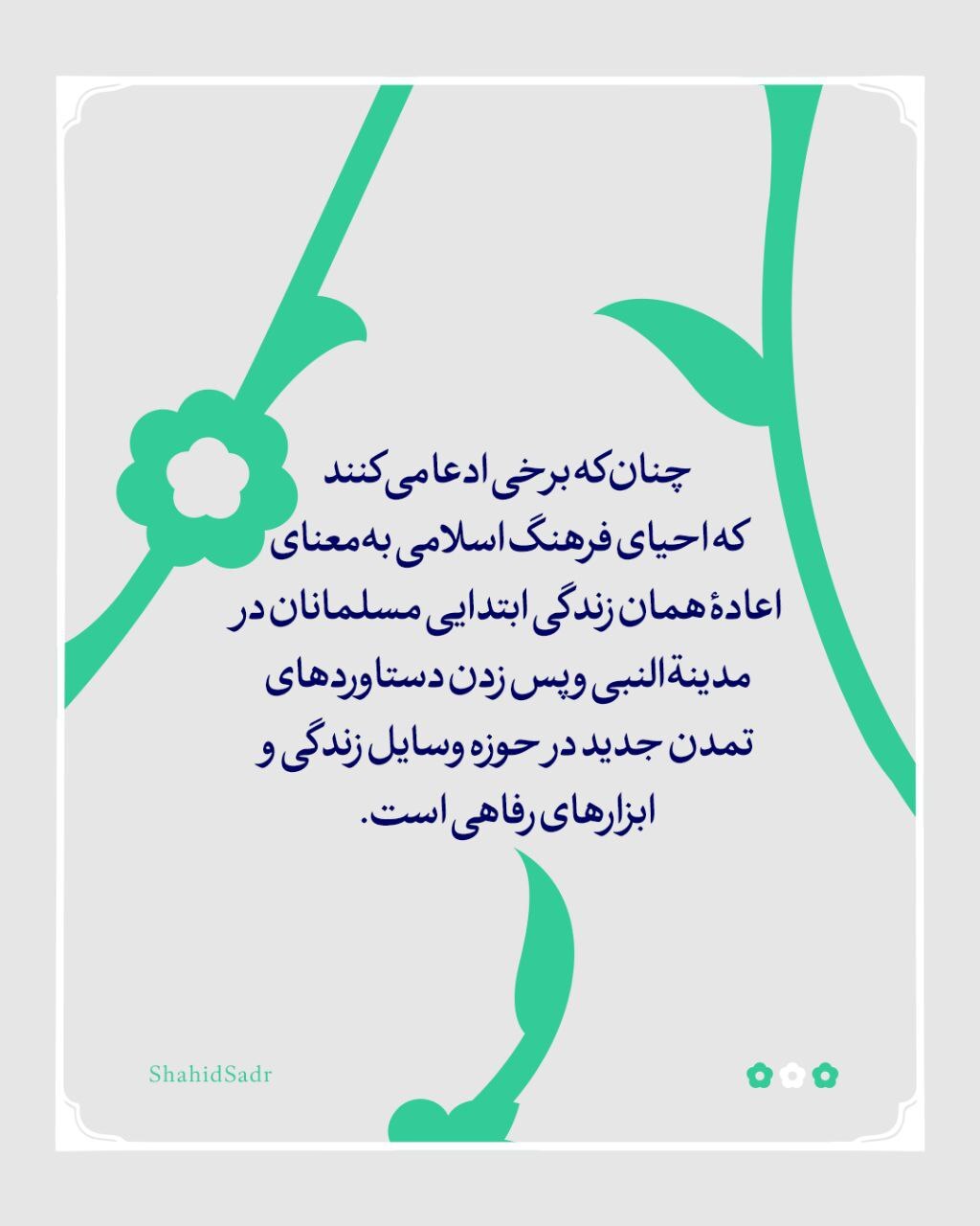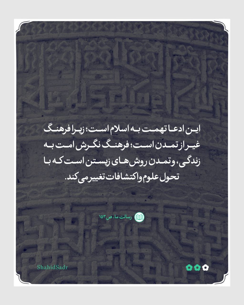 وقتی از فرهنگ اسلامی و جایگزین کردن آن بهجای فرهنگ غربی یا هر فرهنگ دیگری، با هر شکل و از هر منبعی که قرآن نیاورده است، سخن میگوییم، از امت نمیخواهیم که از تمدن جدید و علوم آن دست بردارد. چنانکه برخی ادعا میکنند که احیای فرهنگ اسلامی بهمعنای اعاده همان زندگی ابتدایی مسلمانان در مدینةالنبی و پس زدن دستاوردهای تمدن جدید در حوزه وسایل زندگی و ابزارهای رفاهی است. این ادعا تهمت به اسلام است؛ زیرا فرهنگ غیر از تمدن است؛ فرهنگ نگرش امت به زندگی، و تمدن روشهای زیستن است که با تحول علوم و اکتشافات تغییر میکند. [شهید محمدباقر صدر، کتاب رسالت ما، ص١۵٣]