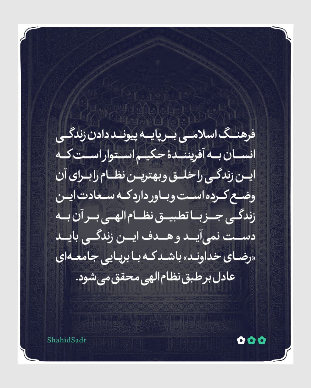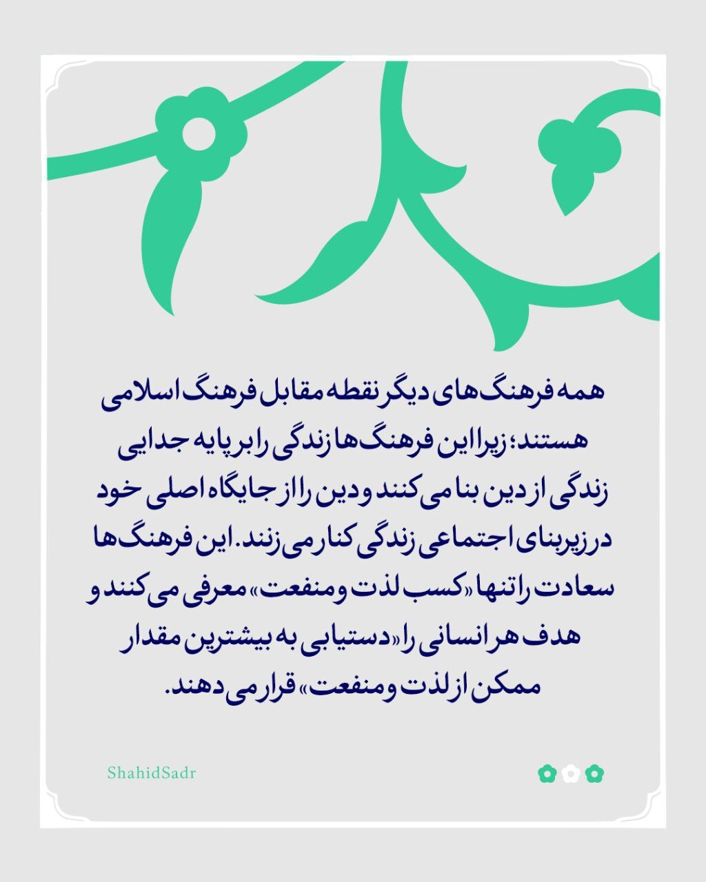 فرهنگ اسلامی بر پایه پیوند دادن زندگی انسان به آفریننده حکیم استوار است که این زندگی را خلق و بهترین نظام را برای آن وضع کرده است و باور دارد که سعادت این زندگی جز با تطبیق نظام الهی بر آن بهدست نمیآید و هدف این زندگی باید «رضای خداوند» باشد که با برپایی جامعهای عادل بر طبق نظام الهی محقق میشود. همه فرهنگهای دیگر نقطه مقابل فرهنگ اسلامی هستند؛ زیرا این فرهنگها زندگی را بر پایه جدایی زندگی از دین بنا میکنند و دین را از جایگاه اصلی خود در زیربنای اجتماعی زندگی کنار میزنند. این فرهنگها سعادت را تنها «کسب لذت و منفعت» معرفی میکنند و هدف هر انسانی را «دستیابی به بیشترین مقدار ممکن از لذت و منفعت» قرار میدهند. [شهید سید محمدباقر صدر، کتاب رسالت ما، ص۵٣-۵۴]