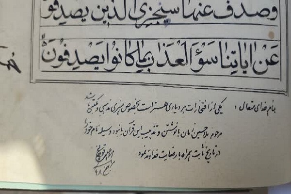 به گزارش ایکنا، قرآن خطی و نفیس روستای شورچه که روز گذشته دوشنبه 5 آبان در مسجد امام حسن مجتبی(ع) این روستا از توابع شهرستان قوچان استان خراسان رضوی، رونمایی شد، حدود 120 سال پیش از سوی ملاحسین زمان از هنرمندان فقید این خطه، کتابت، صفحهآرایی و نگارگری شده است.