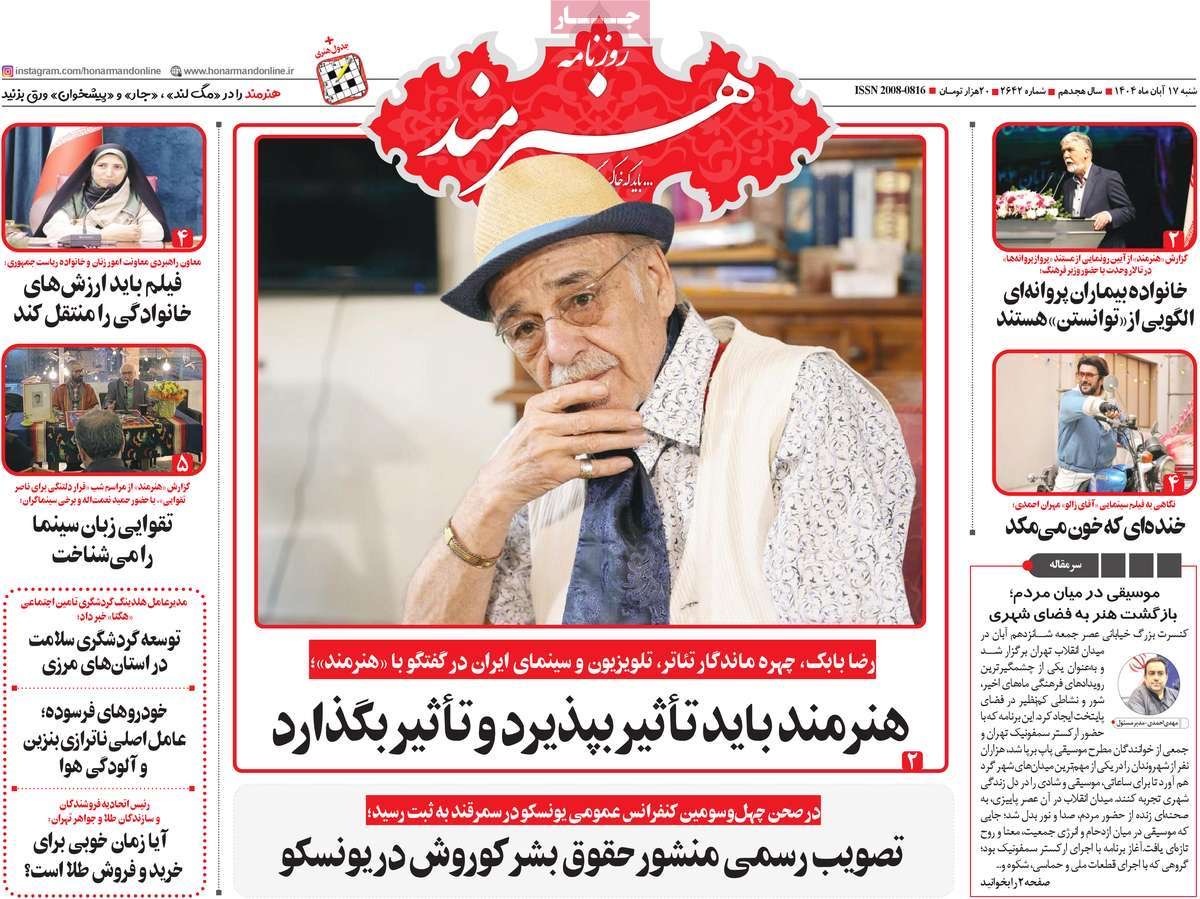 صفحه نخست روزنامههای شنبه ۱۷ آبان ۱۴۰۴ را که به خشکسالی احتمالی و جیرهبندی آب، هنر انقلاب، تاریخ اقتدار و مهمترین رویدادهای ورزشی پرداختهاند؛ در ادامه مشاهده میکنید.