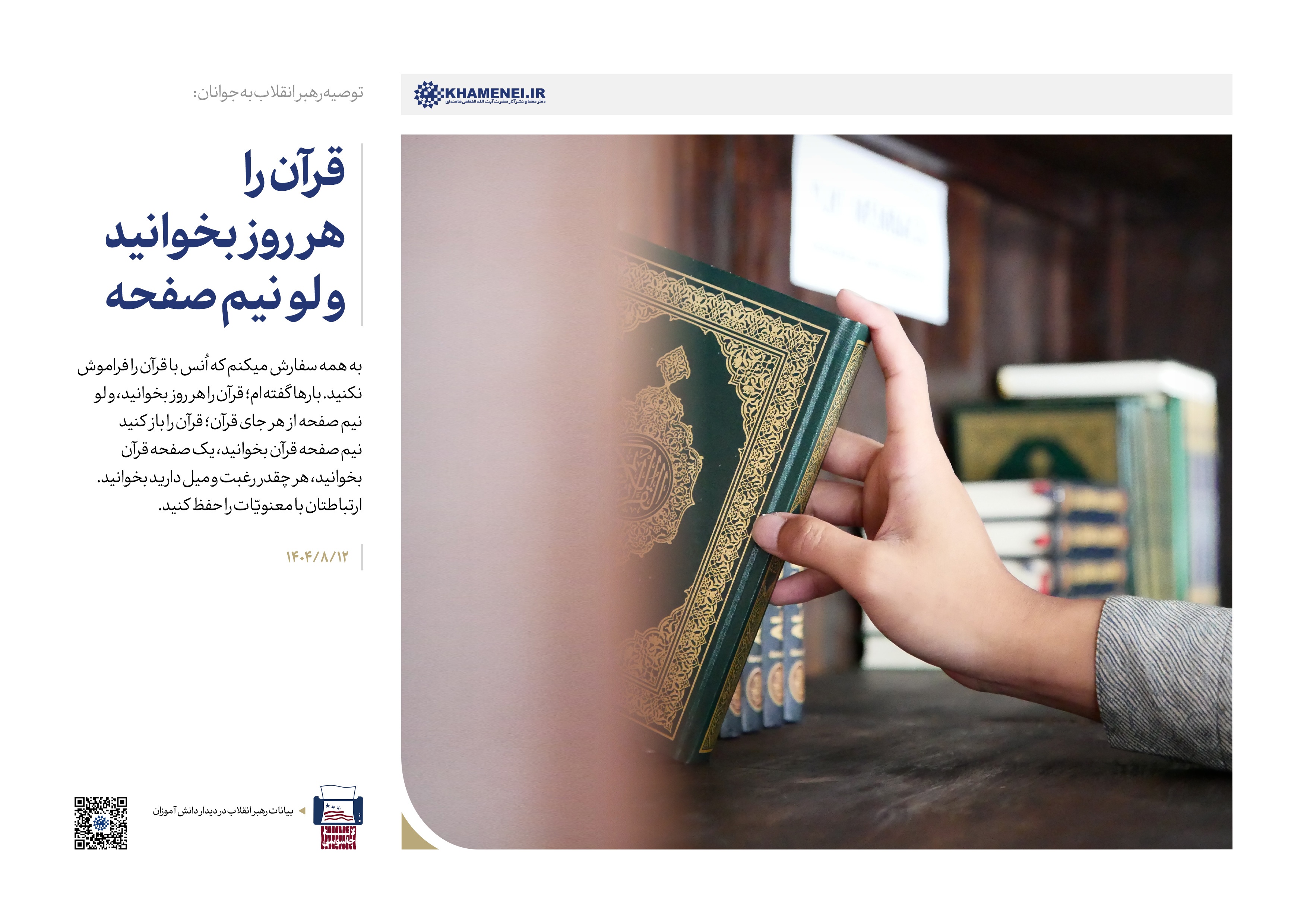 به همه سفارش میکنم که اُنس با قرآن را فراموش نکنید. بارها گفتهام؛ قرآن را هر روز بخوانید، ولو نیم صفحه از هر جای قرآن؛ قرآن را باز کنید، نیم صفحه قرآن بخوانید، یک صفحه قرآن بخوانید، هر چقدر رغبت و میل دارید بخوانید. ارتباطتان با معنویّات را حفظ کنید. [رهبر معظم انقلاب؛ ۱۴۰۴/۰۸/۱۲]