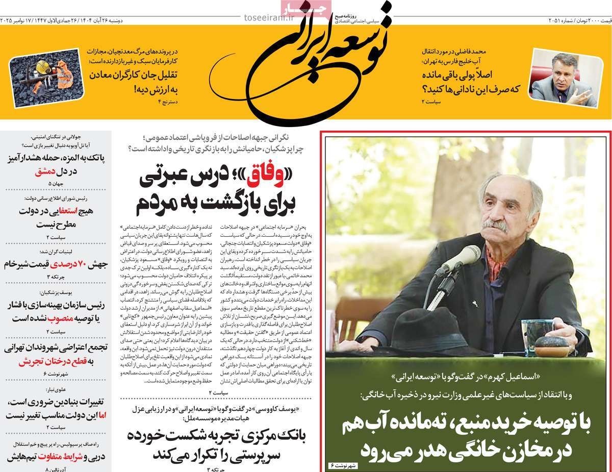 صفحه نخست روزنامههای چهارشنبه ۲۶ آذر ۱۴۰۴