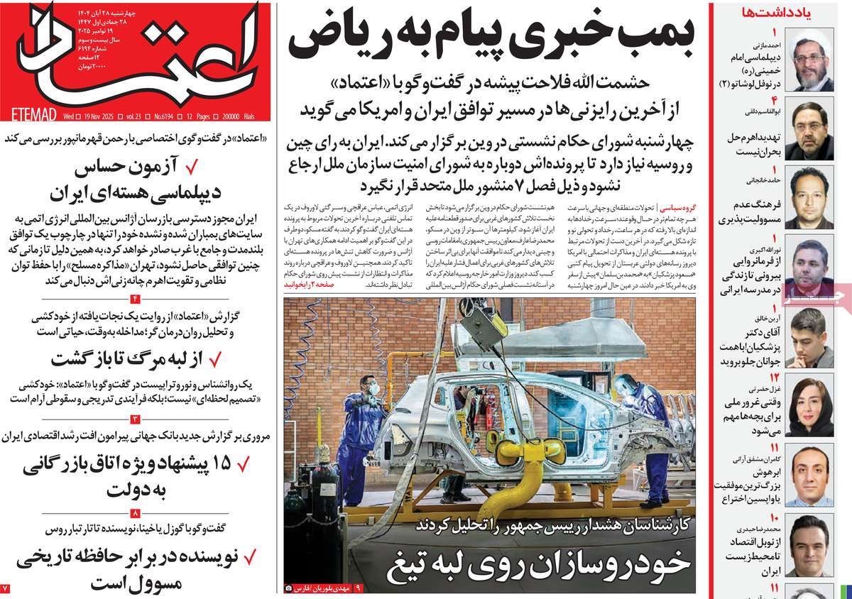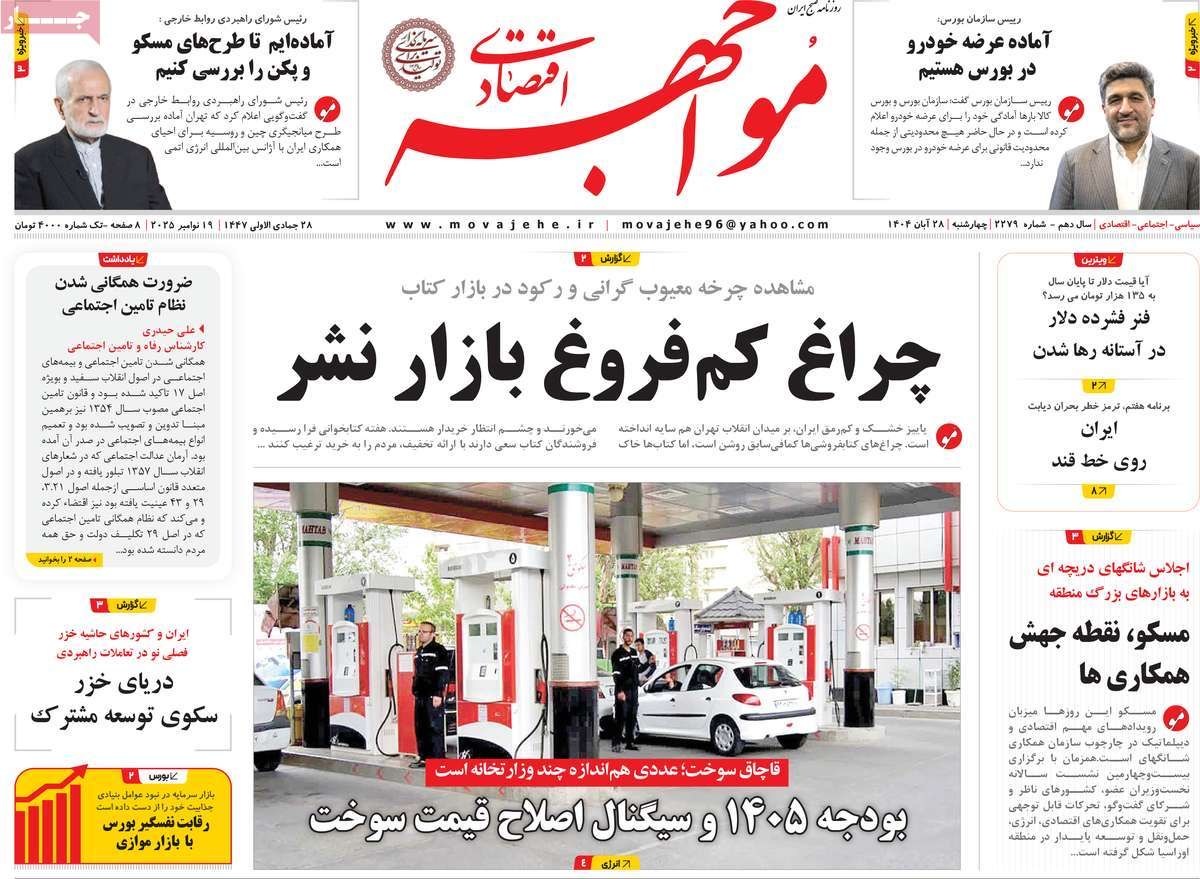 صفحه نخست روزنامههای چهارشنبه ۲۸ آبان ۱۴۰۴ را که به بلاتکلیفی بنزین، دیپلماسی در خدمت تجارت، یک عمر زیستن با کتاب و مهمترین رویدادهای ورزشی پرداختهاند؛ در ادامه مشاهده میکنید.