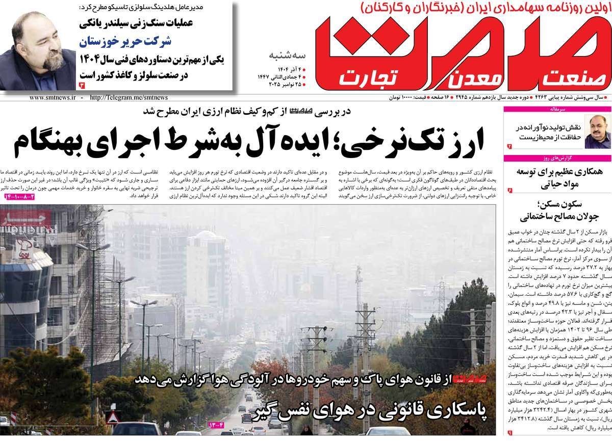 صفحه نخست روزنامههای سهشنبه ۴ آذر ۱۴۰۴ را که به کلانشهرها زیر گنبد دود، بیعت فاطمی با شهدا، دادخواهی در لاهه و مهمترین رویدادهای ورزشی پرداختهاند؛ در ادامه مشاهده میکنید.