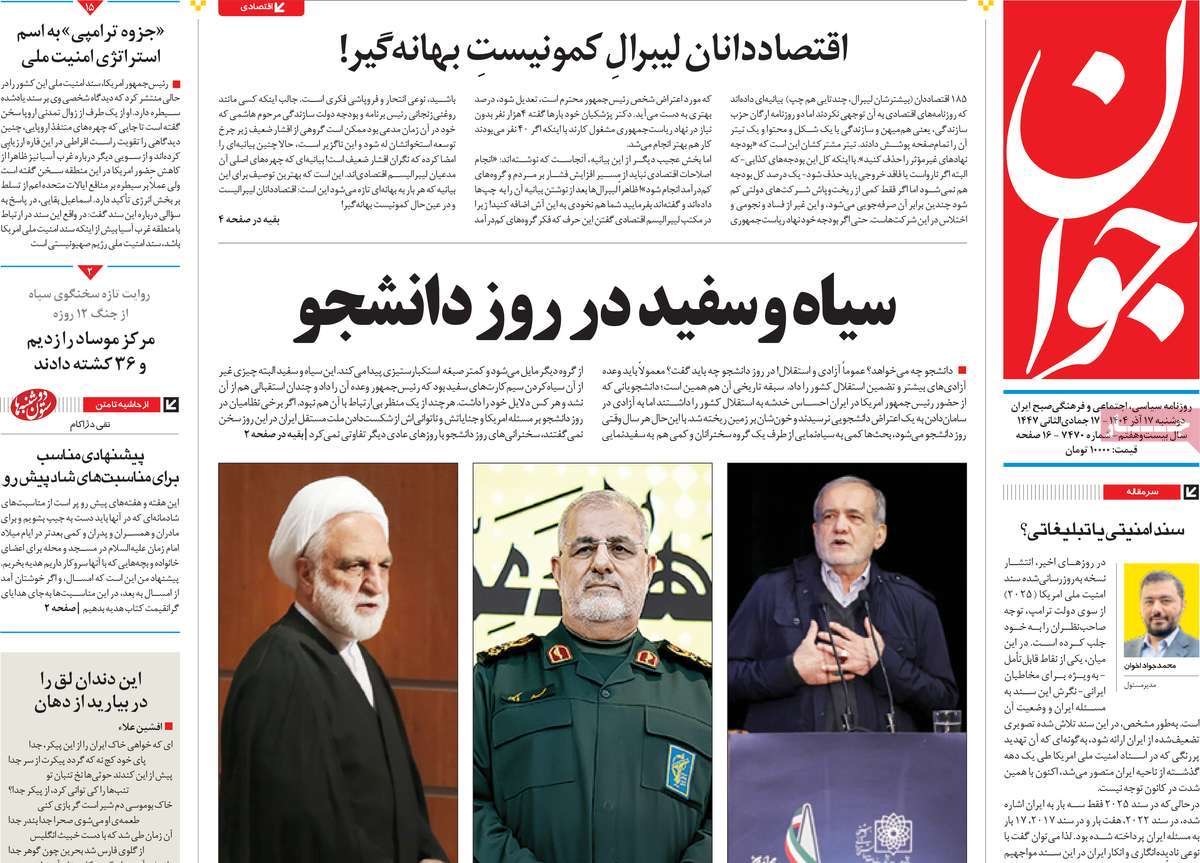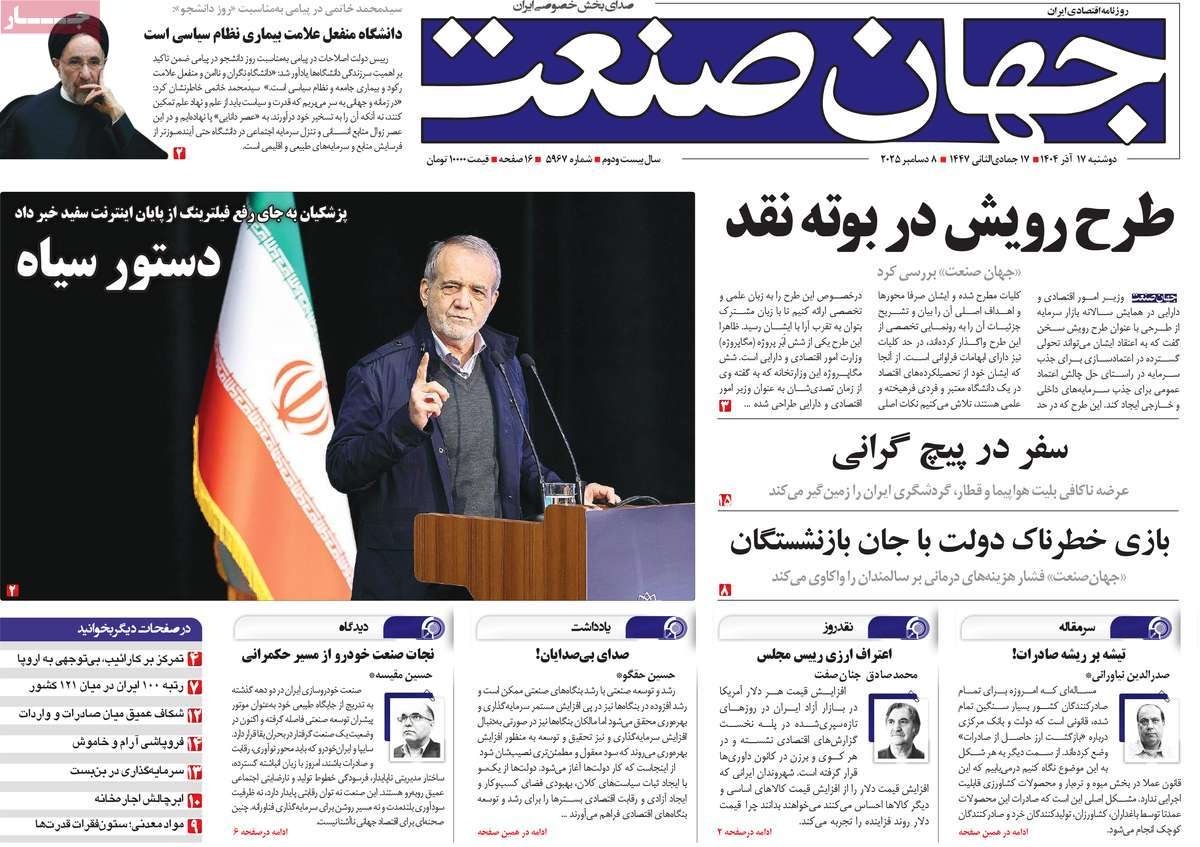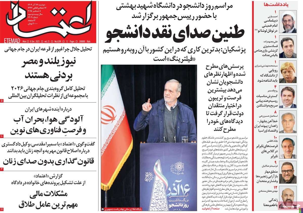 صفحه نخست روزنامههای دوشنبه ۱۷ آذر ۱۴۰۴ را که به طنین صدای نقد دانشجو، پرسشگران وطندوست، صعود دلار و سقوط ما و مهمترین رویدادهای ورزشی پرداختهاند؛ در ادامه مشاهده میکنید.