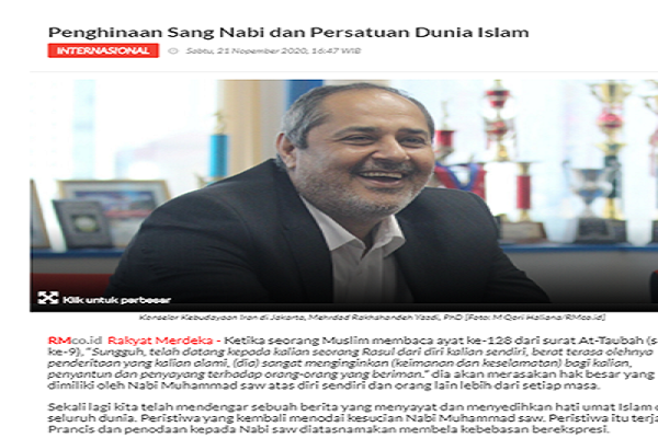 En réponse aux manques de respect du gouvernement français au Prophète de l'Islam (psl), Mehrdad Rakhshandeh, conseiller culturel iranien, a publié un article intitulé « Insulte au Prophète (psl) et unité du monde islamique » dont la traduction a été remise aux sites d'information de ce pays.