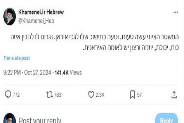 Dans ce message, publié sur la page X (ex-Twitter) du bureau de protection et de publication des œuvres de l’Ayatollah Khamenei, le Guide a déclaré : « Le régime sioniste a commis une erreur ; il a fait une erreur de calcul vis-à-vis de l’Iran. Nous leur montrerons la puissance, la capacité, l'initiative et la volonté du peuple iranien. »
